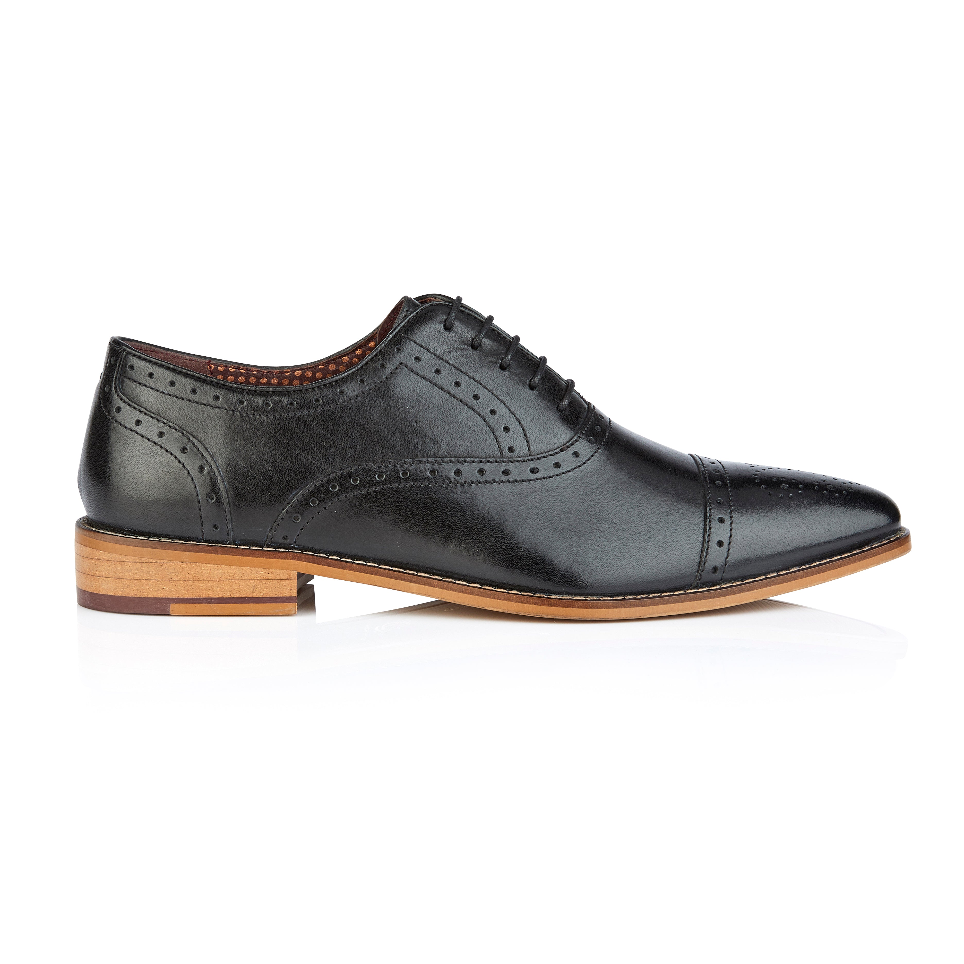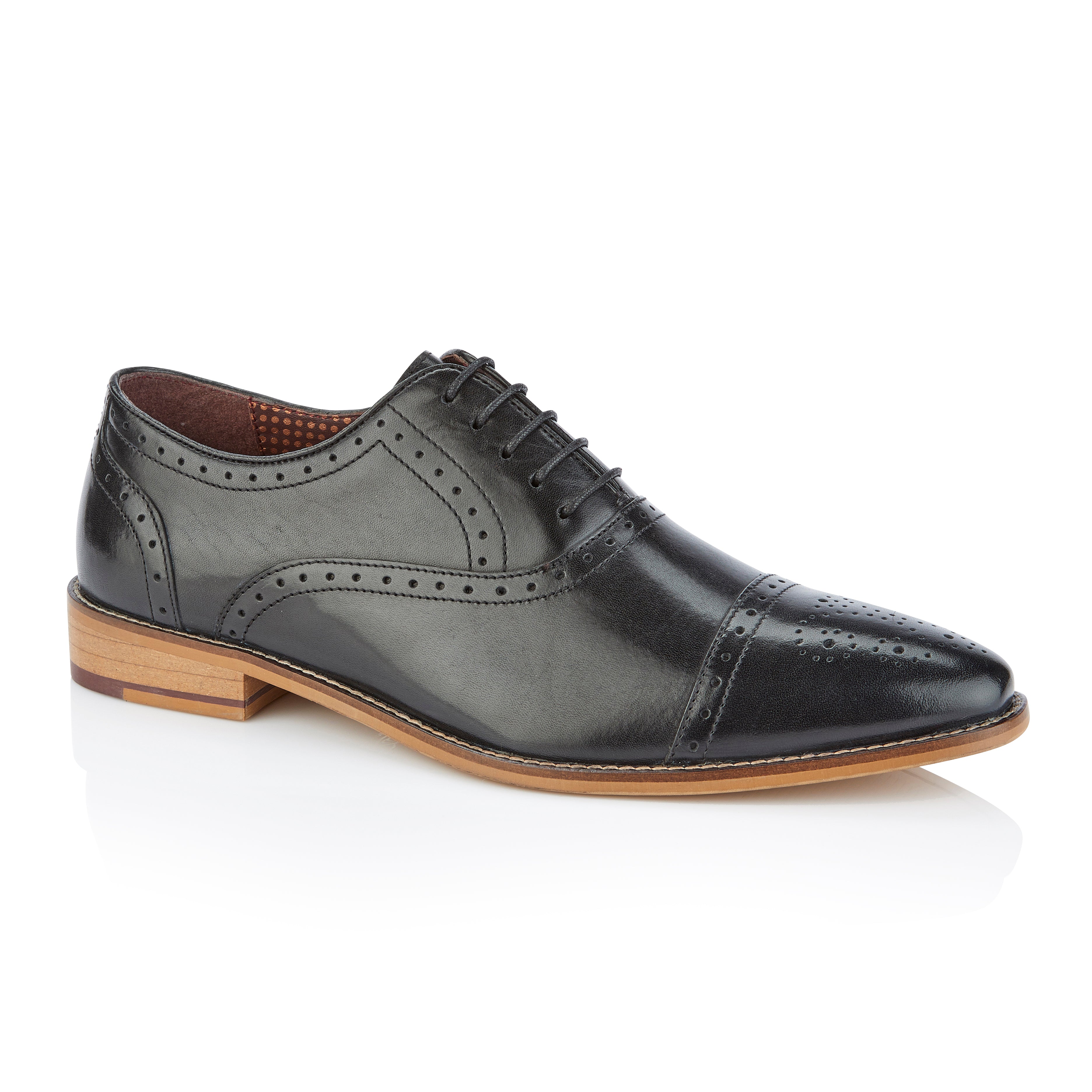 Our stunning Arthur is the elegant Oxford lace up shoe that every man needs for his wardrobe. With our beautiful brogue detail on the toe cap, vamp and counters, we have created our own contemporary and distinctive design in smooth black leather. The classic Oxford silhouette and shape makes this mens Oxford shoe perfect for any smart occasion.