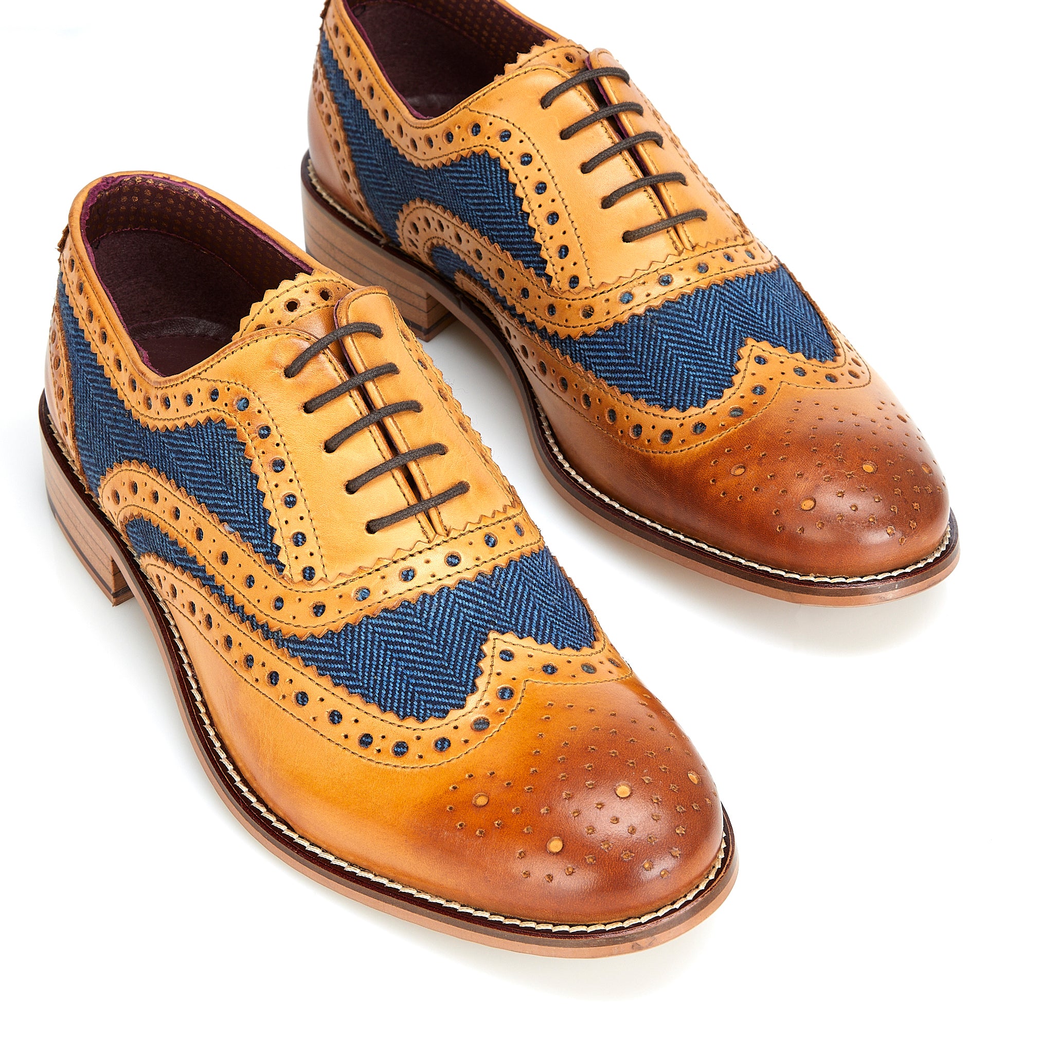 The spectator shoe is what our brand is best known for and it is the men's Gatsby shoe that put us on the map! This Gatsby shoe stands out from regular tan brogues by pairing tan leather with blue tweed panels on the vamp and quarter. With our unique London Brogues pattern on the distinctive wingtip toe cap. Gatsby combines the smartness of an Oxford shoe with the contemporary style and comfort of London Brogues’ footwear.