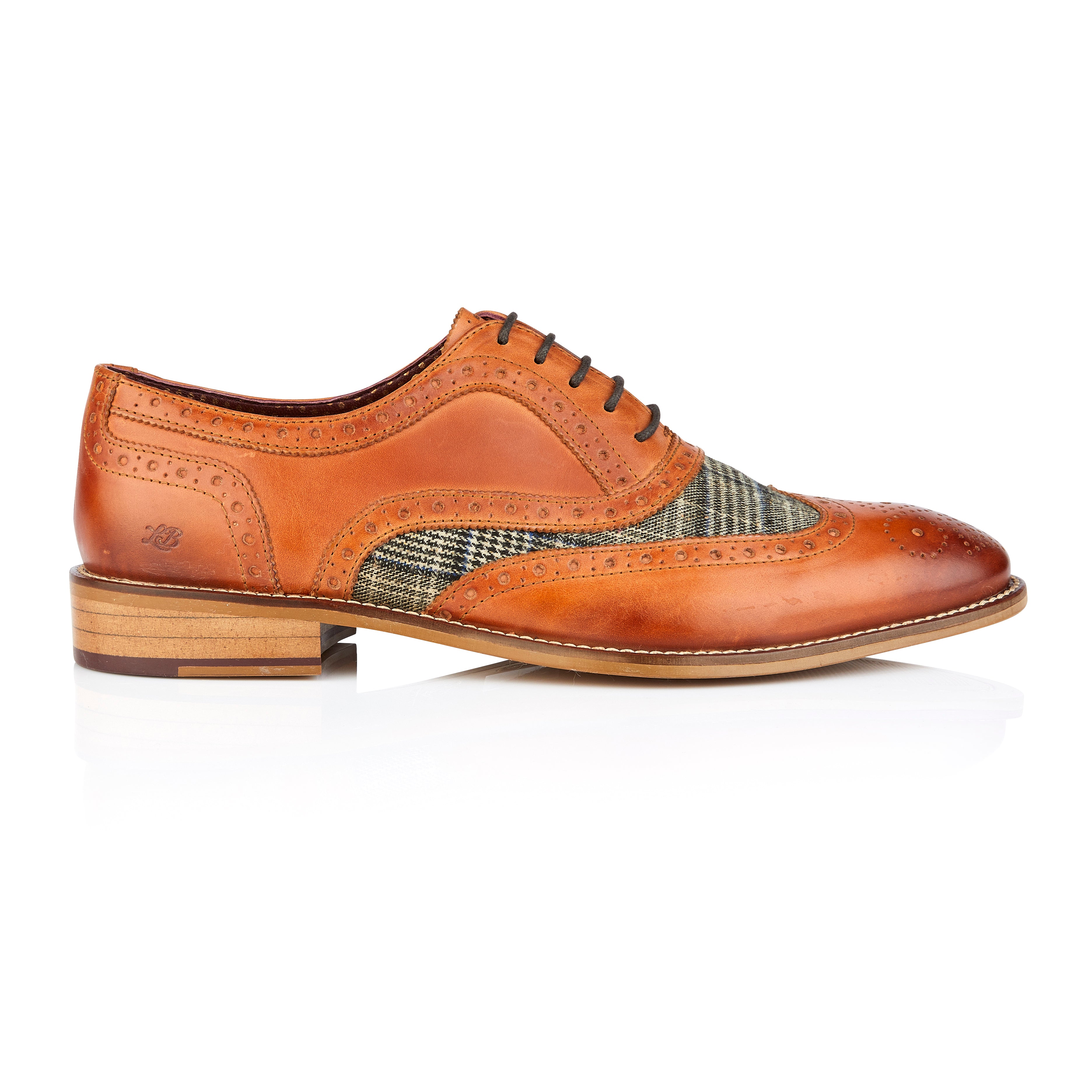 Our Shelby is another Oxford brogue shoe that marries the iconic Oxford silhouette with contrasting colours and materials to create a classic yet contemporary design fit for work and play. Hand-stitched from tan leather and tweed, the mens Shelby Oxford in Tan and Tweed adds elegant class and personality. As ever the perfect finish is our unique London Brogues brogue pattern, which when paired with tweed creates a vintage, heritage aesthetic.