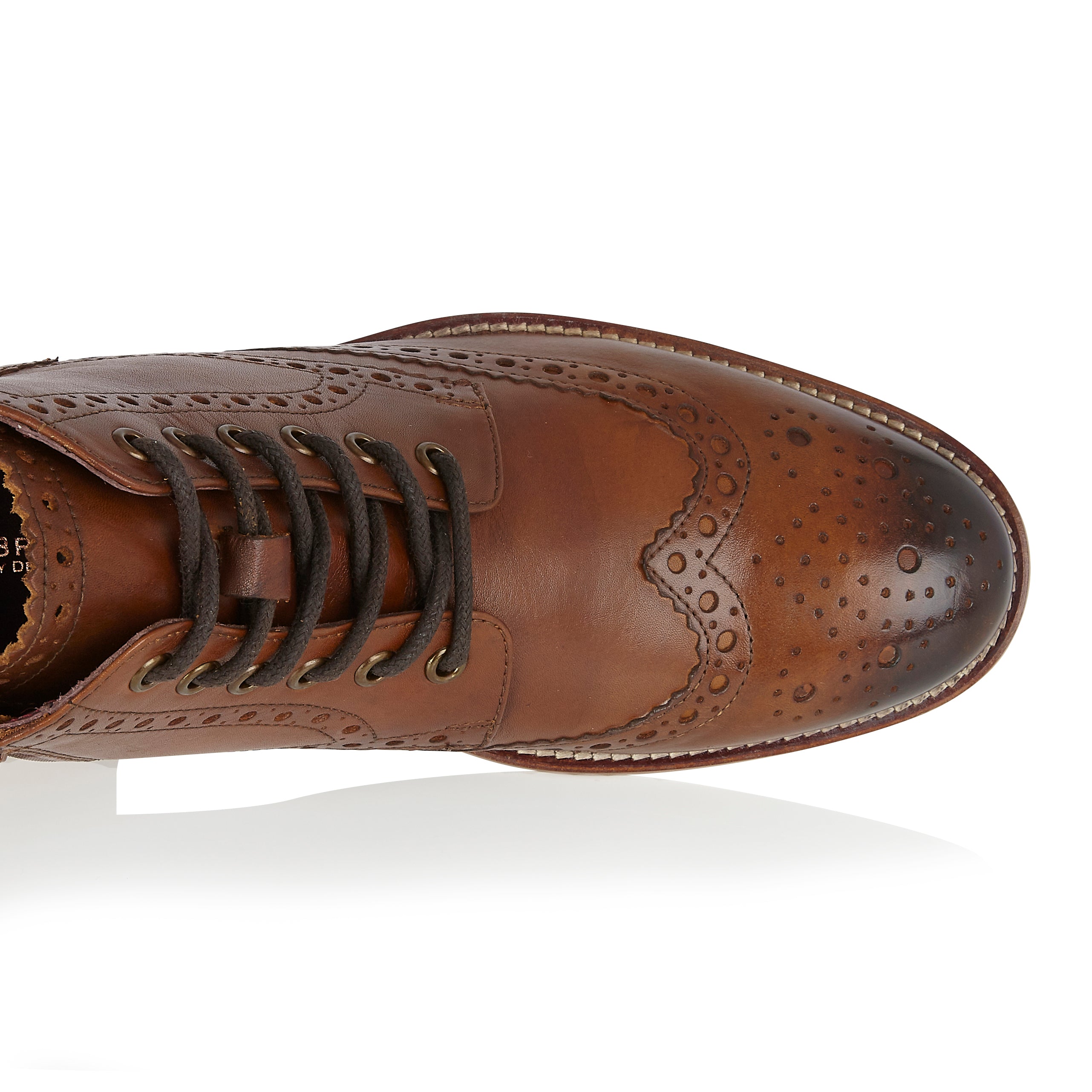 The Gatsby mens boot in Chestnut is our hand finished lace up men's boot. Made from high quality, chestnut leather, with our unique London Brogues pattern on the distinctive wingtip toe cap.
